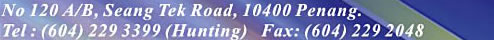 No 120A/B, Jln Seang Tek, 10400 Penang. Tel:04-229 3399 .... Fax: 04-229 2048 |